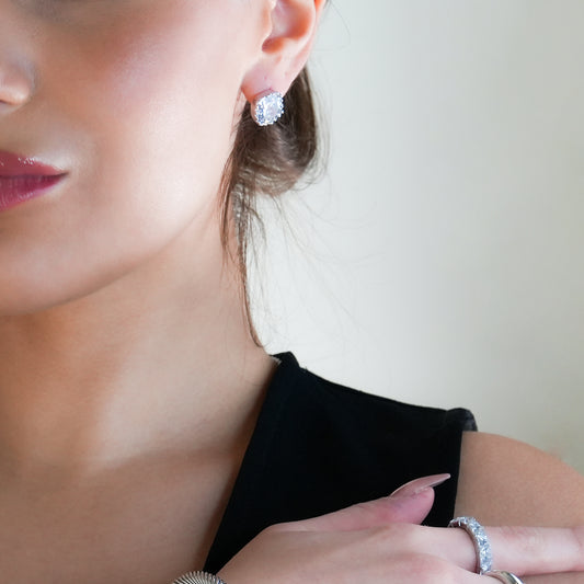 RICCA Silver: Moissanite (Diamond Alternative) Square Shaped Ornate Cased Essential Daily Studs.
